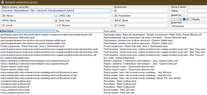 Co, jeśli chcemy jednocześnie zmieniać nazwy wszystkich e-booków w formatach EPUB, MOBI i PDF? Wystarczy w narzędziu wielokrotnej zamiany podać wywołania obu wspomnianych wtyczek.
