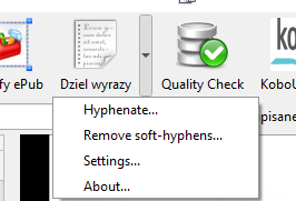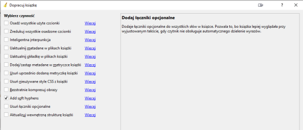 Co więcej, z identycznego pliku korzysta program Calibre, który w ramach funkcji „Dopracuj książkę” ma również dodawanie łączników opcjonalnych – jako „Add soft hyphens”.