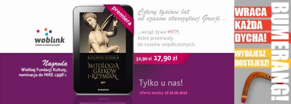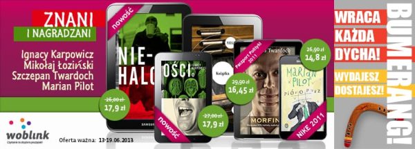 - Woblink: akcja Bumerang – każdy kto dokona zakupów na minimum 20 złotych dostanie jeden kod za każdą wydaną dychę. Taki kod ważny jest przez 45 dni i obniża ceny innych książek o 10 złotych (maksymalnie do 14,90 zł). Zwróćcie uwagę, że w czerwcu zasady się trochę zmieniły.