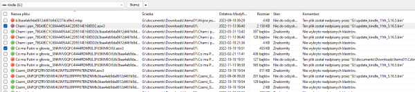 - Im szybciej podejmiemy próbę odzyskania plików, tym lepszy jest efekt. Używanie czytnika sprawi, że plik może zostać nadpisany przez inny. W oknie powyżej widzimy np. komunikat dla jednej z książek: Ten plik został nadpisany przez „G:\update_kindle_11th_5.16.5.bin” – po prostu jakiś czas po usunięciu pliku czytnik ściągnął aktualizację, a ta została zapisana w jego miejscu.
