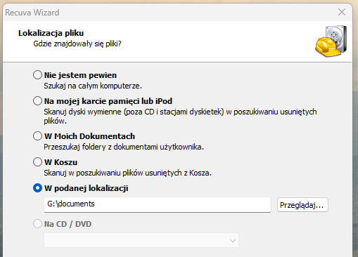 Po uruchomieniu programu widzimy „wizarda”, który przeprowadza nas przez kolejne kroki odzyskiwania danych.